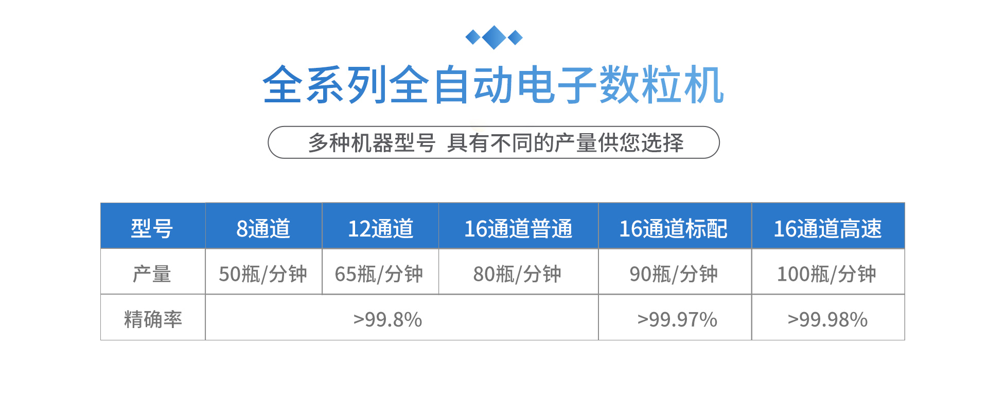 可對寬度在3-25毫米(定制至50毫米)范圍內的各種規(guī)格的片劑、膠囊劑、丸劑等固體顆粒進行裝瓶、裝袋、裝盒的計數(shù)分裝。
