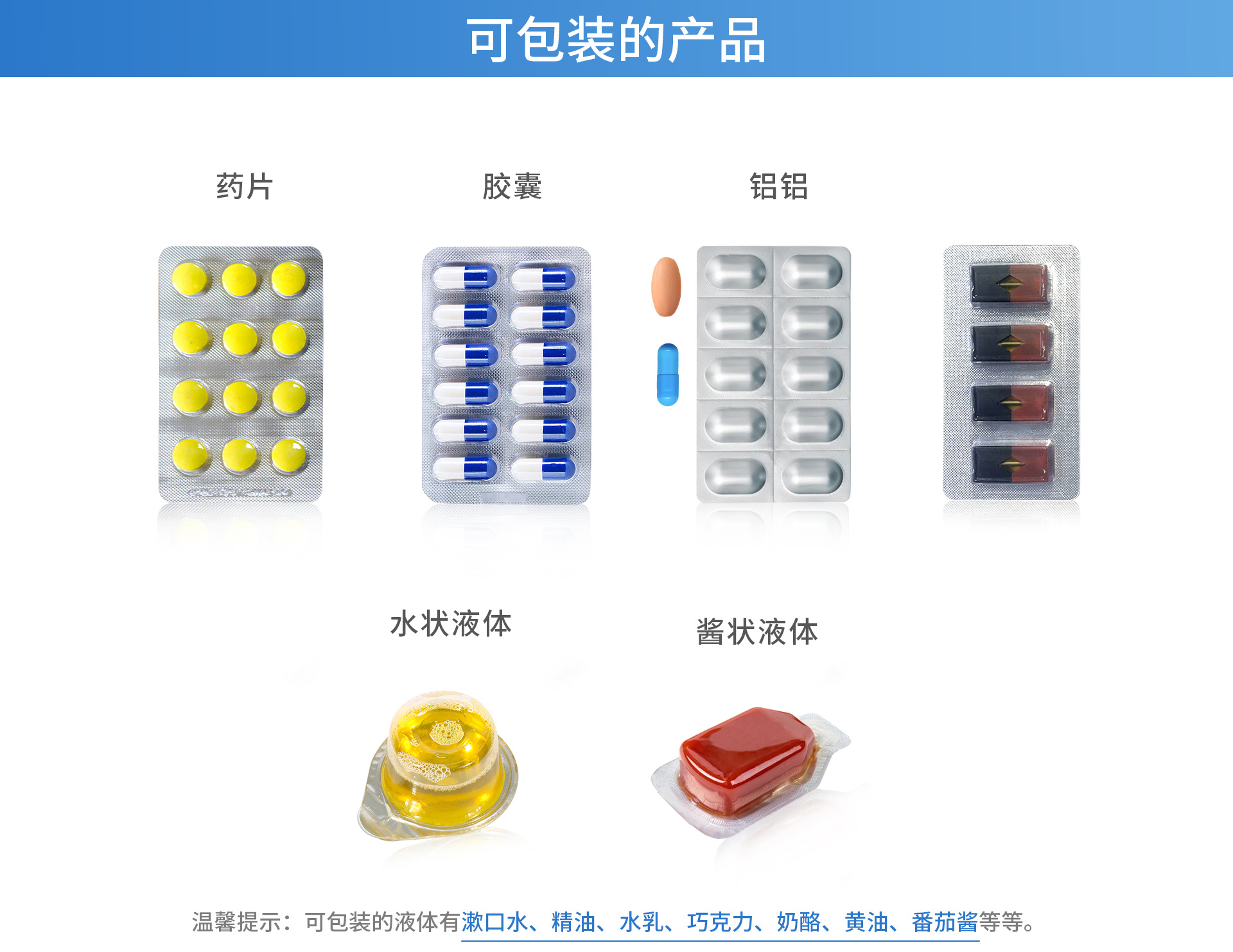 具備全自動成型、加料、封口等功能,可以包裝藥片、膠囊、糖果、電子煙、及異形物、大蜜丸、西林瓶等大尺寸的物料,符合GMP生產(chǎn)要求,是制藥、保健品、化工、電子、食品等中大批量生產(chǎn)的理想產(chǎn)品。