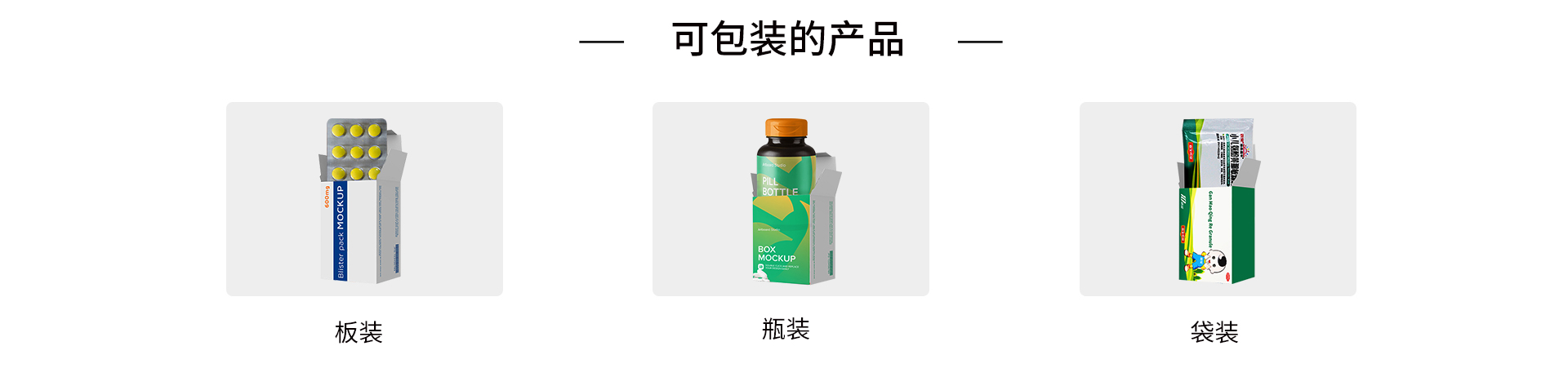 可對(duì)鋁塑板、藥膏、軟袋、電子煙、洗面奶、各類(lèi)瓶裝等物體進(jìn)行全自動(dòng)快速裝盒,具備全自動(dòng)下料、吸盒、成型、在線(xiàn)傳送、說(shuō)明書(shū)折疊、物料檢測(cè)、產(chǎn)品入盒、打印批號(hào)、插舌、封盒、剔廢等功能。