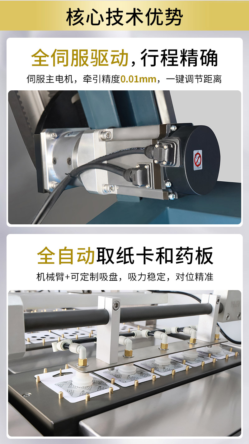 RQ-BCP-500G 系列鋁塑紙卡包裝機是我司新研發(fā)的一款專門針對高端藥品、保健品鋁塑紙卡包裝而開發(fā)的全伺服履帶式包裝設(shè)備,具有全自動取紙卡、取藥板、二次取卡,封合、出料等功能,速度快,準確率高,熱封嚴密,產(chǎn)品美觀等有優(yōu)勢,是易折彎、易吸潮、要求便捷攜帶藥品包裝不可或缺的理想產(chǎn)品,符合GMP、cGMP標準。