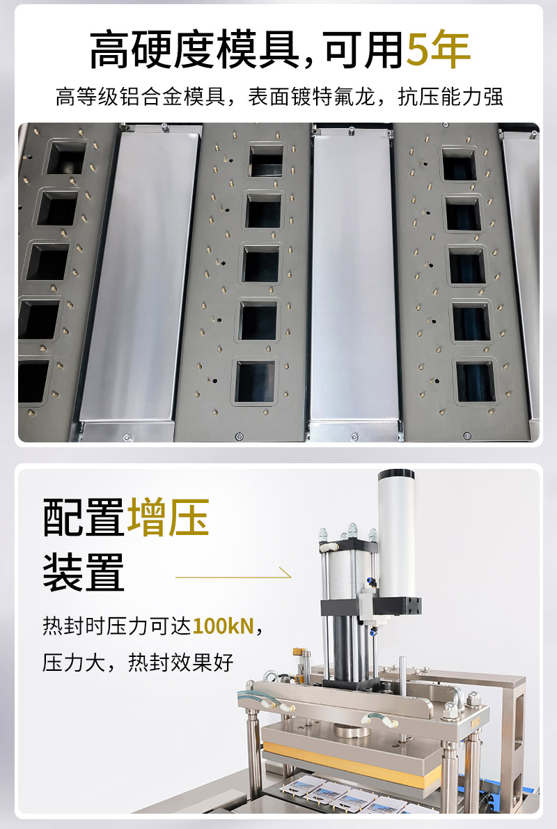 5、熱封工位模具采用特氟龍?zhí)幚?,表面光滑度更?抗壓力能力更強,可以使用5年以上。