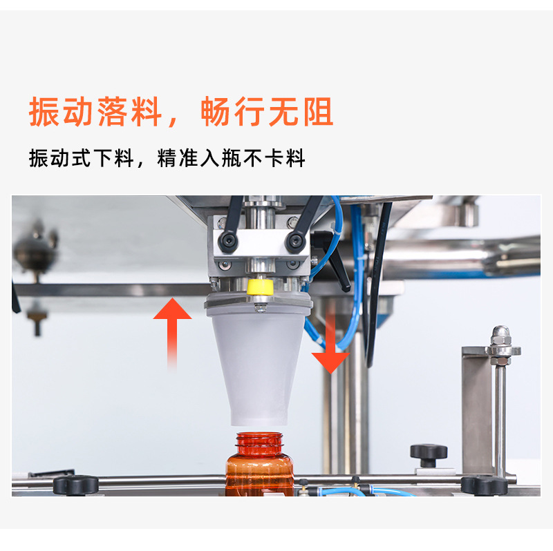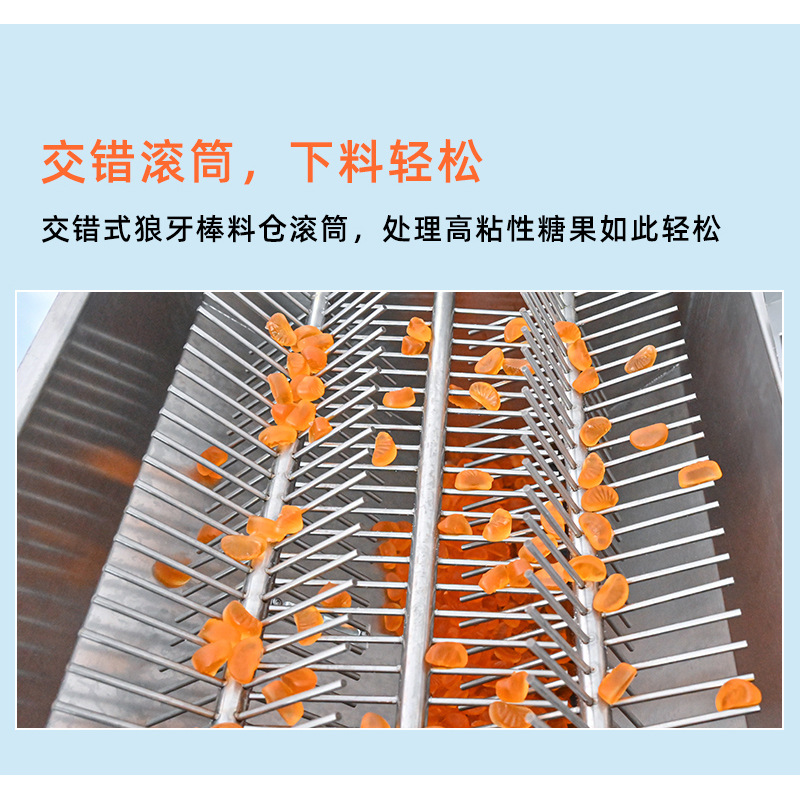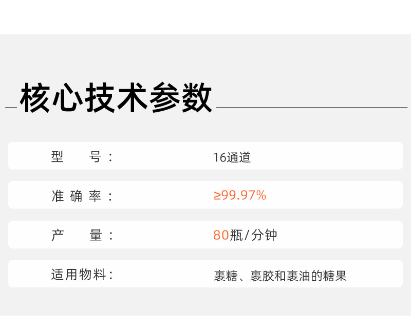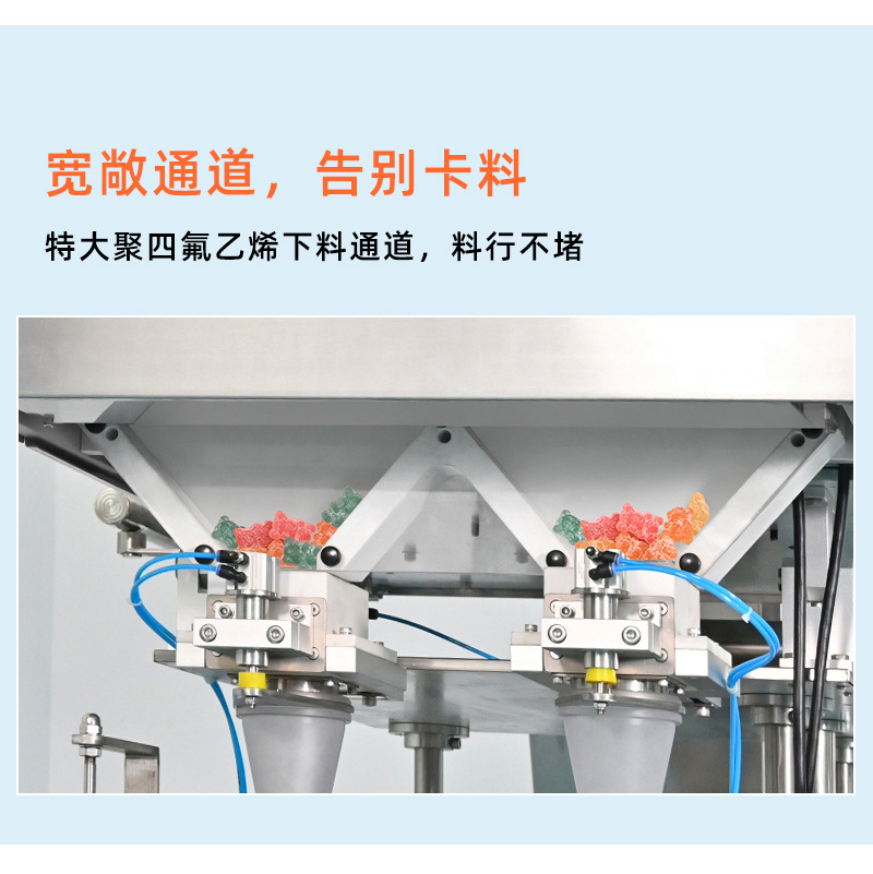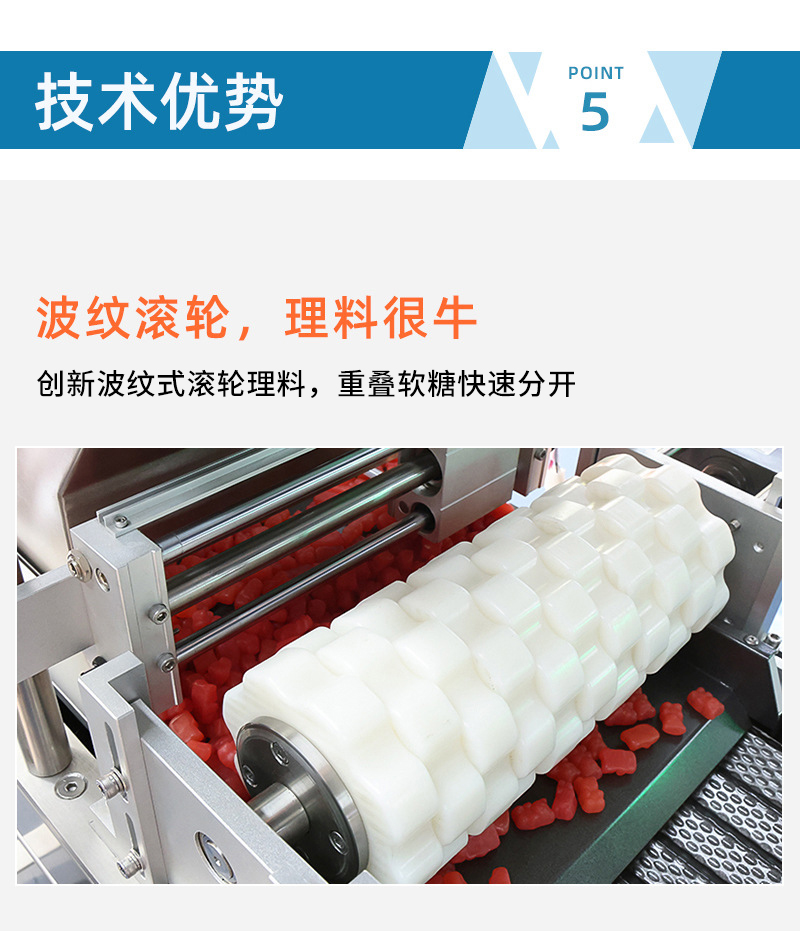 可對(duì)小熊糖果、方糖、軟糖等進(jìn)行精確數(shù)粒裝瓶、裝袋、裝盒的計(jì)數(shù)分裝。特制蜂窩狀震蕩槽,高效分離物料。特大聚四氟乙烯下料通道,不堵料。一對(duì)一高精度掃描光電眼,360度掃描,精確率>99.7%。